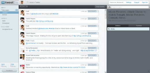 Cotweet is designed to manage your business activity via twitter. It helps companies to reach customers easily and promotes productivity. It supports to add multiple twitter accounts and helps in assigning tasks between accounts. It also has scheduling tweets, easy interface and tracking the bit.ly clicks using the API feature. Much clearly and neatly designed UI helps everyone to understand its functionality in one shot. Just sign up once free and you will feel the difference how twittering fun and productive too.